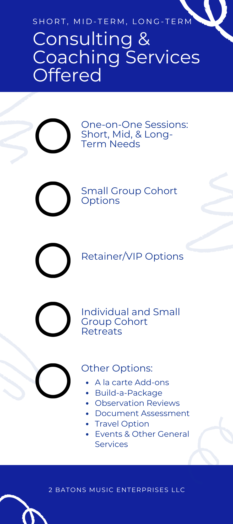 The retreat is specially designed and balanced for one-on-one client assistance depending on the situation and needs. As an activity of the 2 Batons Music Enterprises, LLC, the retreats also have the ability to include a guest session from the other corresponding Director/Consultant, with the potential for other guests.